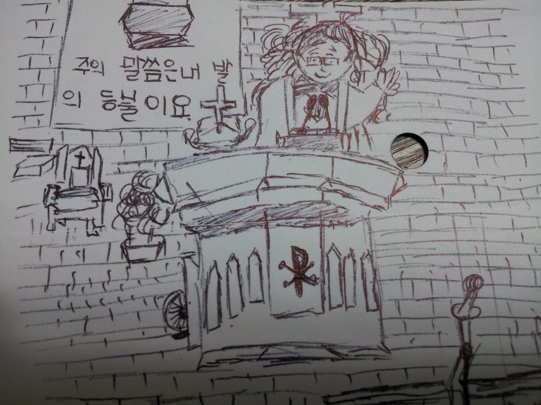 예배시간에 수아가 그려 낸 과천교회 주현신 목사님.
